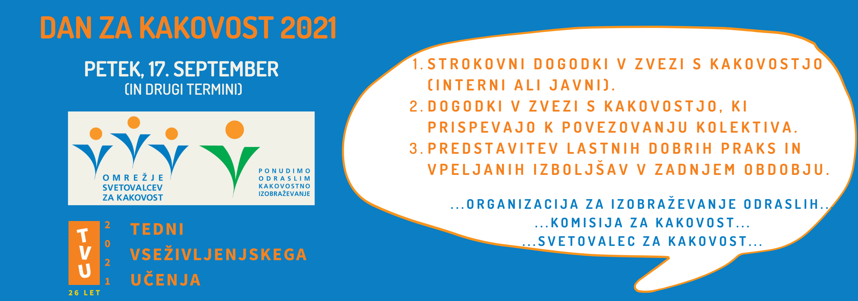 Med pestrimi vsebinami Tednov vseživljenjskega učenja od leta 2019 svetovalci za kakovost uspešno umeščamo tudi vsebine kakovosti v izobraževanju odraslih.