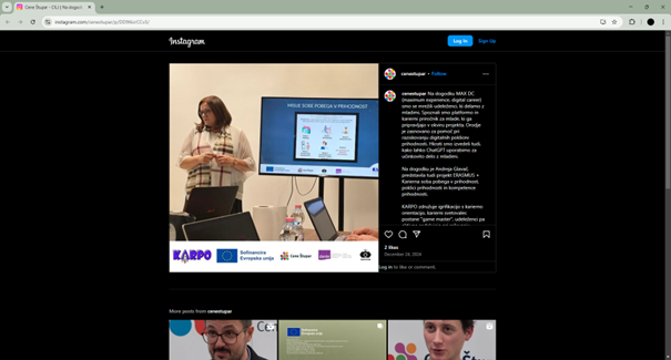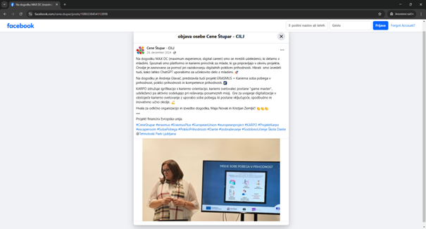 Na dogodku MAX DC (maximum experience, digital career) smo se 11. decembra 2024 mrežili udeleženci, ki delamo z mladimi. Spoznali smo platformo in karierni priročnik za mlade, ki ga pripravljajo v okviru projekta. Orodje je zasnovano za pomoč pri raziskovanju digitalnih poklicev prihodnosti. Na dogodku je Andreja Glavač predstavila tudi projekt ERASMUS + KARPO.